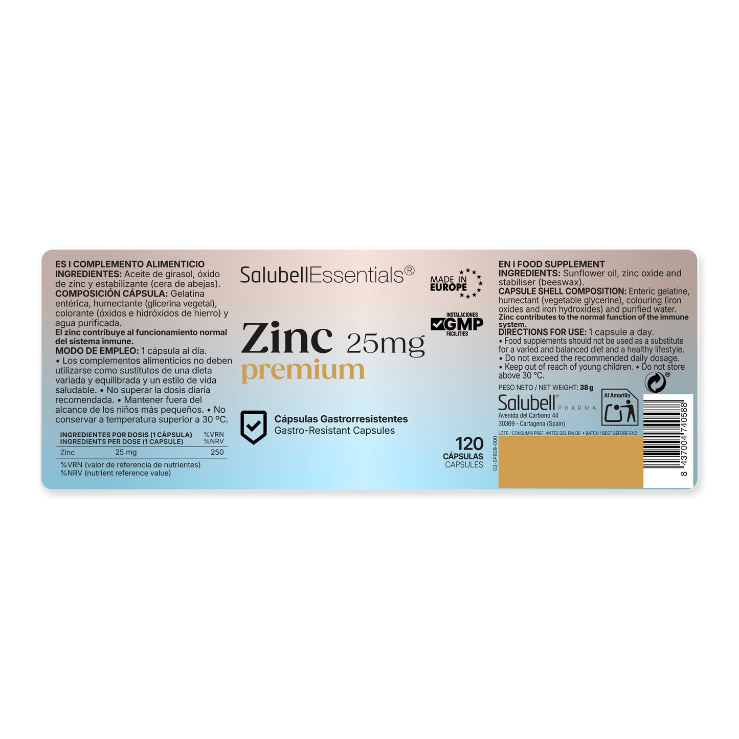 Salubell Essentials® Zinc contains Zinc Oxide, a form with a high mineral concentration, presented in an advanced format of gastro-resistant capsules.